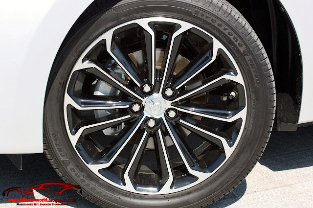 Corolla offers a broad range of wheels ranging from 15-inch wheels with covers (L and LE Eco grades), 16-inch steel wheels with covers (LE and S), 16 inch aluminum wheels (LE), a 16-inch aluminum design unique to the Eco grade and 17-inch alloy wheels unique to the S grade. The wheels help emphasize the character of each Corolla model, with the most fuel-economy-focused Corolla LE Eco wearing 15-inch wheels with covers shod in low rolling resistance 195/65R-15 rubber. At the other side of the Corolla spectrum is the sportiest grade of Corolla S that wears impactful available 17-inch alloy wheels covers in more performance oriented 215/45R-17 rubber. The 16-inch wheels used for the LE (both the steel and aluminum) and the 16-inch aluminum aero-wheel for the LE Eco model all use a 205/55R-16 tire.
